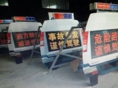 2、材料说明:面层为铝质板材,粘敷反光膜喷绘而成的警车尾图,将图案及字样的轮廓嵌入红色高倍LED发光管,上置红、蓝暴闪灯各四套,下方左右各置一套全红刹车灯,后盖用不锈钢板封装,包边骨架及后沿支撑架采用4cm×6cm×2mm热镀锌管,结构合理,用材精致。